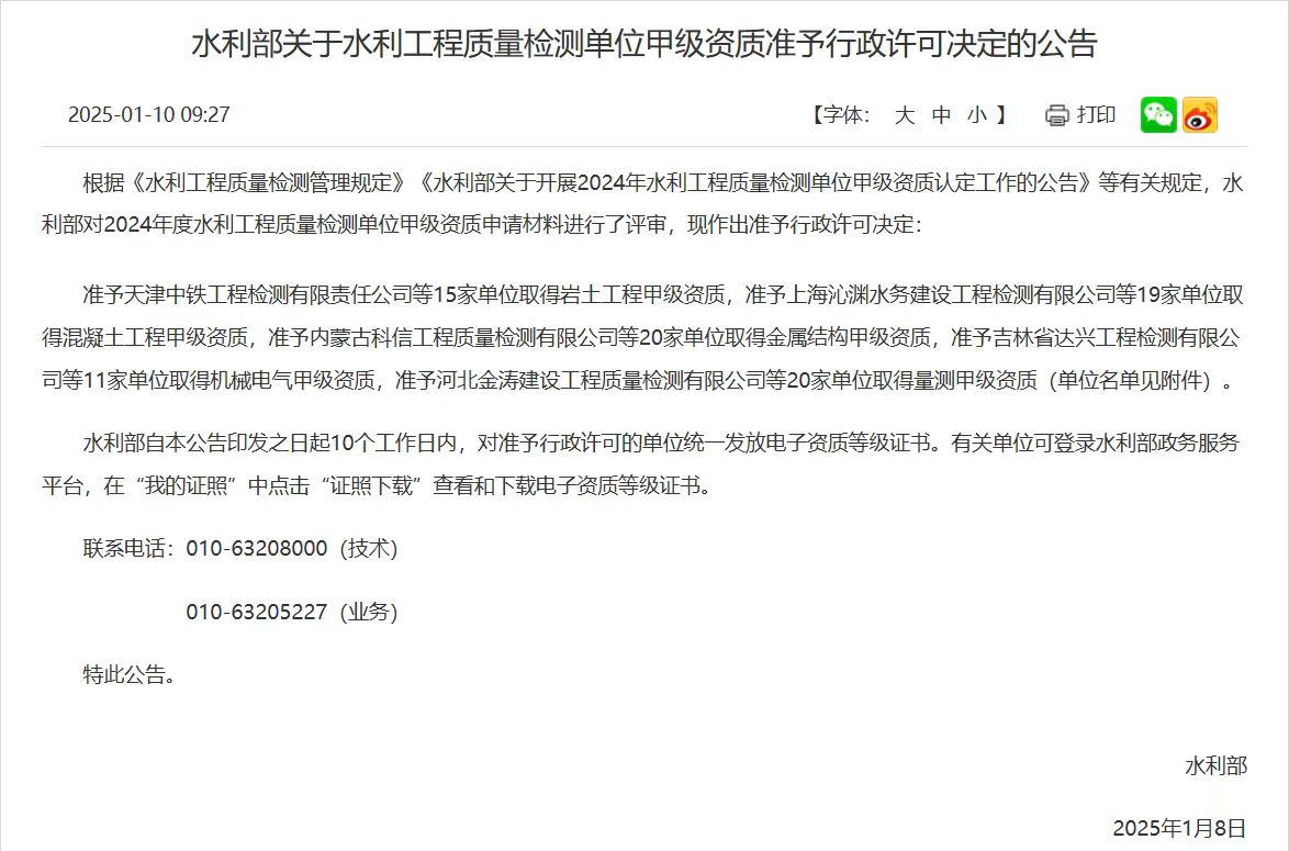 2025年1月10日,水利部網(wǎng)站發(fā)布公告,中騰智信正式取得水利工程質(zhì)量檢測機(jī)構(gòu)混凝土工程類、金屬結(jié)構(gòu)類和量測類三項(xiàng)甲級資質(zhì)。